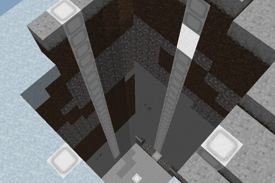 Main entrance to an astronaut lair that is entirely underground. This lair's main entrance is 3 blocks underground. This lair also has a 3x3 shaft that ends 8 blocks underground.
