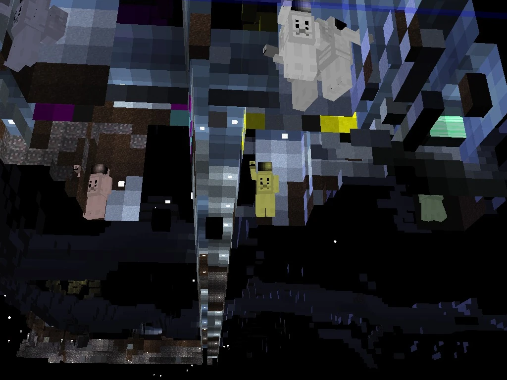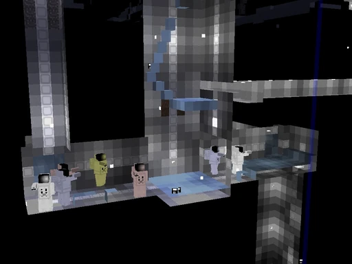 When I found this lair, all of the astronauts pictured were at the bottom of the deep shaft in the lower-right. I stumbled into the lair while trying to quarry a giraffe, then entered it via the small connecting corridor seen in the upper-right. I sealed off the 3x3 horizontal dead-ends with ice, then brought the astronauts up to the main level by slowly adding blocks of ice to the bottom of the deep shaft, lifting the astronauts up one layer at a time. I am leaving them here until I work out a good way to raise them the rest of the way to my sorting corridors.