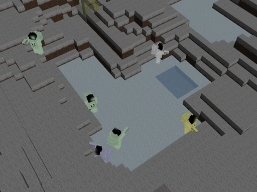 Although astronauts of the different colors often fight one another, they also can peacefully coexist with one another. It seems that about half of the astronauts that enter a pit like this will be shot by another astronaut shortly after entering the pit. After a while the shooting stops and any remaining astronauts then remain indefinitely.