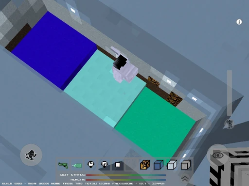 The astronaut pictured here is in a pit that has three levels. The dark blue level is one block higher than the center (cyan) level, which is turn is one block higher than the green level.