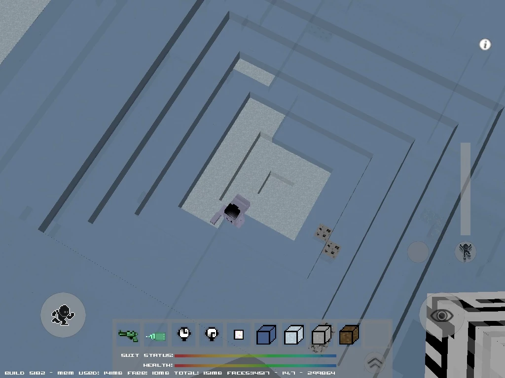 In these tests it is easy to spot astronauts trying to climb the walls. In the photo, the powder-blue astronaut near the very top of the photo is climbing the back wall. He has gone up about 3 or 4 blocks. I watched one of these climb up one block at a time, then turn and jump. They are usually facing towards the pit and land in the same sector they started in.