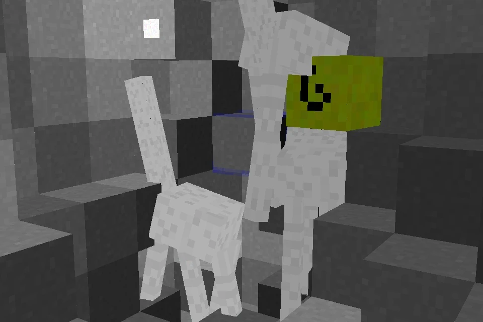 Before I could do that, I saw this streak of white fall in front of me. I looked down and there was a space giraffe in there with it. I figured, “Okay, this will give me a chance to see if its explosion affects other mobs.” So, I started digging the 2x2 block shaft all the way down instead of the 1 block shaft I was planning. I didn’t have it dug down my usual 9 block depth before another space giraffe fell into the lair’s entrance shaft, so I decided to put him in with the others. I started to corral him over to my trap shaft when I heard shooting.